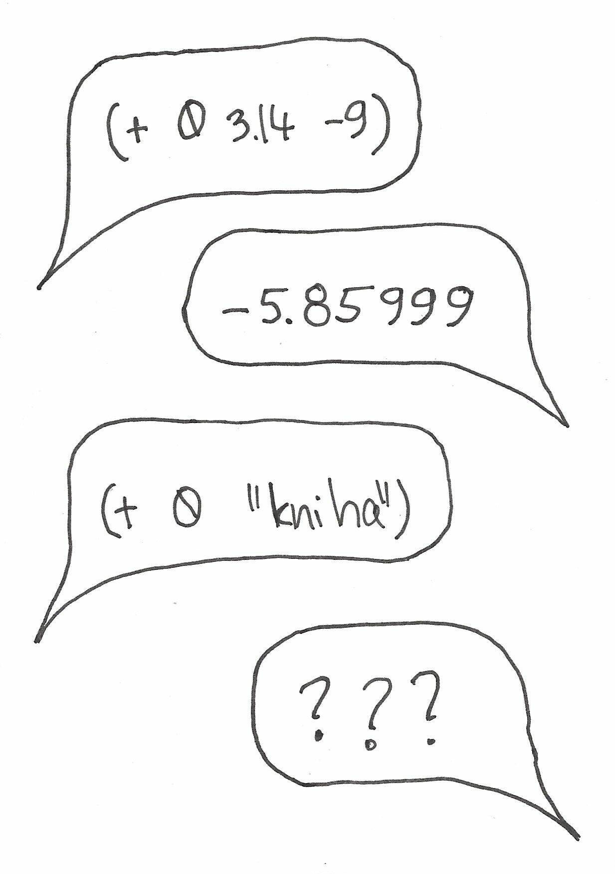 (+ 0 3.14)(string-append "kouzelná" "kniha")Aby čaroděj mohl v kouzelném jazyce vyjádřit, co chce, kromě slov a skladby věty (odborně syntax) potřebuje znát i význam slov (odborně sémantika), protože i když slova zná a vytvoří kouzelnou větu podle správných pravidel, výsledek nemusí dávat smysl. Věta
